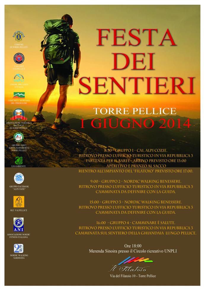 Il giorno domenica 8 Giugno 2014 si organizza la "FESTA DEI SENTIERI", con passeggiate sui sentieri del territorio di Torre Pellice, in collaborazione con: Comune di Torre Pellice, Associazione Turistica Pro Loco Di Torre Pellice, CAI Uget Val Pellice,Comunità Montana del Pinerolese, Gruppo "Alpi Cozie", Nordic Walking Benessere a 360°, Gruppo "Camminare è Salute".