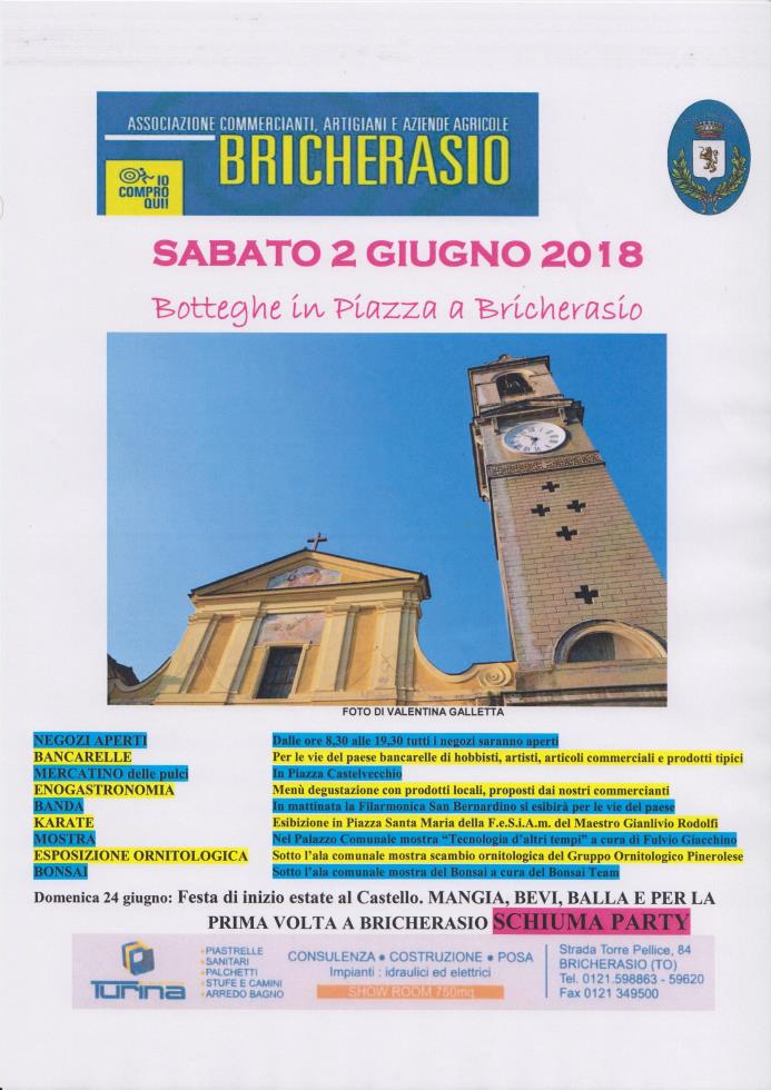 L'Associazione Commercianti artigiani e aziende agricole di Bricherasio con il patrocinio del Comune organizza per sabato 2 giugno la decima edizione della rassegna denominata “Botteghe in piazza”. In vetrina vecchi mestieri, oggetti in ferro, legno, vetro, ceramica e tessuto e produzioni alimentari realizzate con procedimenti naturali e tradizionali.
