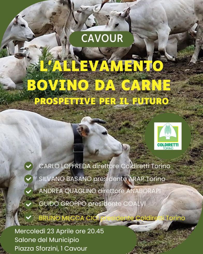 Ore 20.45 Convegno “L’allevamento bovino da carne - prospettive di futuro” presso salone del Municipio di Cavour (Piazza Sforzini 1) organizzato dalla Coldiretti.